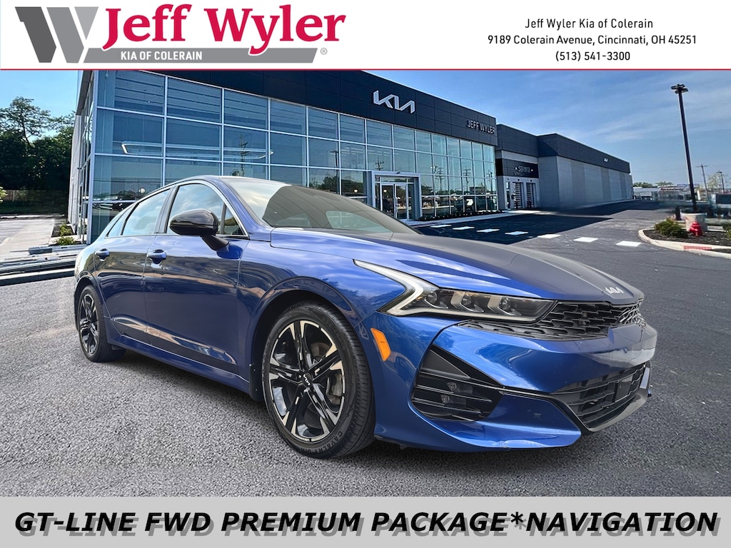Jeff Wyler Kia of Colerain is delighted to offer this gorgeous-looking 2022 Kia K5 GT-Line in Sapphire Blue. GT-Line FWD Premium Package (Forward Collision Avoidance-Assist - Cyclist, Forward Collision Avoidance-Assist - Junction Turn, Gloss Black Pillar & Door Frame Cover, and Highway Driving Assist), 4-Wheel Disc Brakes, 6 Speakers, ABS brakes, Air Conditioning, Alloy wheels, AM/FM radio: SiriusXM, Apple CarPlay & Android Auto, Auto High-beam Headlights, Automatic temperature control, Brake assist, Bumpers: body-color, Carpeted Floor Mats, Cloth/Leatherette Seat Trim, Delay-off headlights, Driver door bin, Driver vanity mirror, Dual front impact airbags, Dual front side impact airbags, Electronic Stability Control, Four wheel independent suspension, Front anti-roll bar, Front Bucket Seats, Front Center Armrest, Front dual zone A/C, Front fog lights, Front reading lights, Fully automatic headlights, Heated door mirrors, Illuminated entry, Knee airbag, Low tire pressure warning, Navigation System, Occupant sensing airbag, Outside temperature display, Overhead airbag, Overhead console, Panic alarm, Passenger door bin, Passenger vanity mirror, Power door mirrors, Power driver seat, Power steering, Power windows, Radio data system, Radio: AM/FM/MP3 Audio System, Rear anti-roll bar, Rear seat center armrest, Rear side impact airbag, Rear window defroster, Remote keyless entry, Security system, Speed control, Speed-sensing steering, Split folding rear seat, Spoiler, Sport steering wheel, Steering wheel mounted audio controls, Tachometer, Telescoping steering wheel, Tilt steering wheel, Traction control, Trip computer, Turn signal indicator mirrors, Variably intermittent wipers, and Wheels: 7.5J x 18" Gloss Black Machined Finish Alloy Our PRE-OWNED vehicles are put through a rigorous 167- POINT QUALITY ASSURANCE INSPECTION along with an average amount of over $1,400.00 SPENT to recondition each vehicle so we can be sure to deliver you the highest quality vehicle like you deserve! ***ONLINE PRICE DOES NOT INCLUDE WYLER FAMILY FIRST PACKAGE***