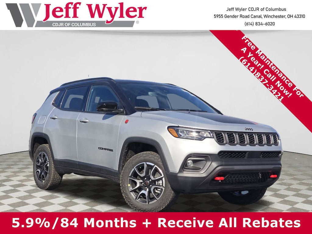 Jeff Wyler Columbus Auto Mall is pleased to offer this terrific-looking 2026 Jeep Compass Trailhawk in Silver Zynith Metallic Clearcoat. Well equipped with: Quick Order Package 29E, 4WD, 10.1" Touchscreen Display, 4-Wheel Disc Brakes, 4.398 Final Drive Ratio, 6 Speakers, ABS brakes, Air Conditioning, Alloy wheels, AM/FM radio: SiriusXM, Auto High-beam Headlights, Auto-dimming Rear-View mirror, Automatic temperature control, Brake assist, Bumpers: body-color, Compass, Delay-off headlights, Driver door bin, Driver vanity mirror, Dual front impact airbags, Dual front side impact airbags, Electronic Stability Control, Four wheel independent suspension, Front anti-roll bar, Front Bucket Seats, Front Center Armrest w/Storage, Front dual zone A/C, Front fog lights, Front License Plate Bracket, Front reading lights, Fully automatic headlights, Heated door mirrors, Heated front seats, Heated steering wheel, Illuminated entry, Knee airbag, Leather Shift Knob, Leather steering wheel, Low tire pressure warning, MyFlexCare Service Plan, Occupant sensing airbag, Outside temperature display, Overhead airbag, Overhead console, Panic alarm, ParkView Rear Back-Up Camera, Passenger door bin, Passenger vanity mirror, Power door mirrors, Power driver seat, Power Liftgate, Power steering, Power windows, Premium Cloth/Leather Trim Bucket Seats, Rain sensing wipers, Rear anti-roll bar, Rear seat center armrest, Rear window defroster, Rear window wiper, Remote keyless entry, Security system, Speed control, Split folding rear seat, Spoiler, Steering wheel mounted audio controls, Tachometer, Telescoping steering wheel, Tilt steering wheel, Traction control, Trip computer, Turn signal indicator mirrors, Variably intermittent wipers, and Wheels: 17" x 6.5" Painted Black Aluminum. 23/31 City/Highway MPGWyler Family First Package Includes: NanoCure Appearance Protection: Exterior & Interior Chemical Sealant Applied to Protect Against Environmental Hazards (7 Year Warranty Coverage). Pulse- Rear End Collision Avoidance System Theft Deterrent Strategy gives you 5 Years of Coverage against vehicle theft, Offering up to a $5,000 benefit. Price does not include Tax, Title, License and Documentary Fee$1000 - 2026 National Retail Bonus Cash . Exp. 03/31/2026 $1000 - 2026 National Stellantis Loyalty Bonus Cash . Exp. 03/31/2026 $500 - 2026 Great Lakes BC Bonus Cash . Exp. 03/31/2026 $500 - 2026 National 2026 Military Bonus Cash . Exp. 01/04/2027