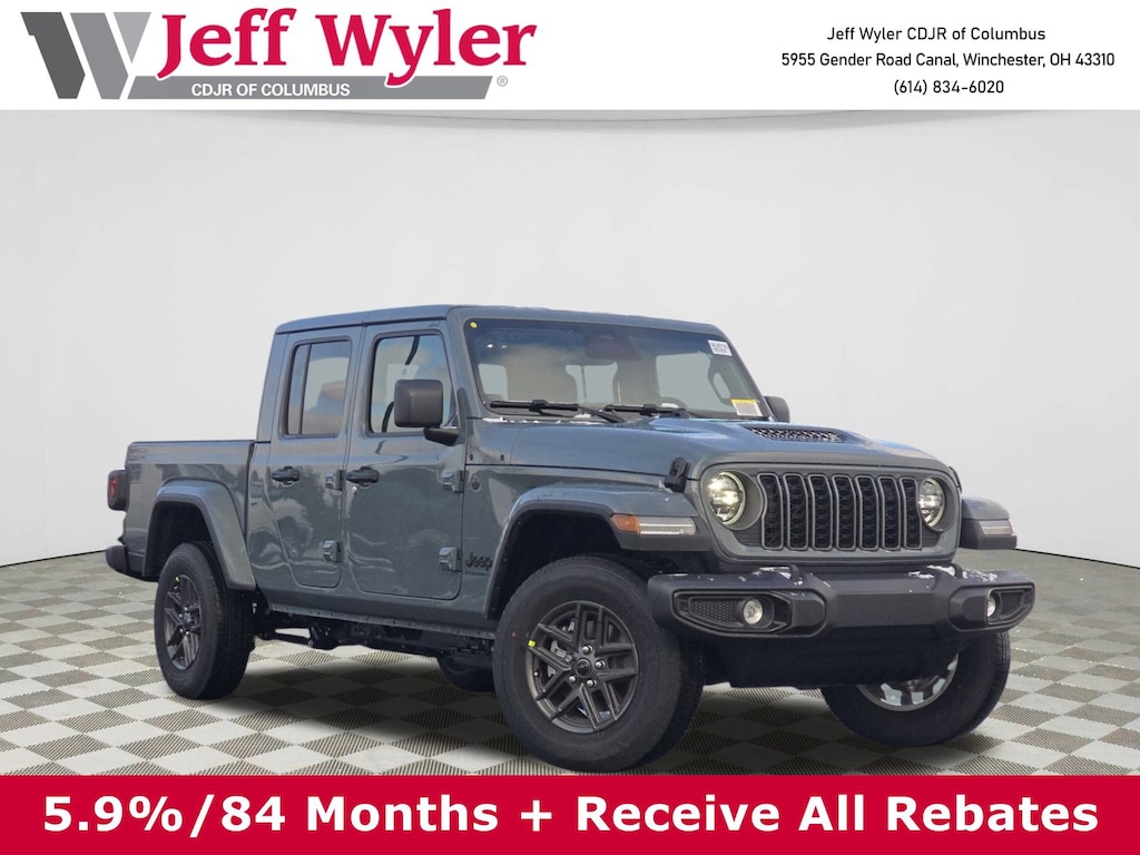 Jeff Wyler Columbus Auto Mall is proud to offer this superb-looking 2026 Jeep Gladiator Sport S in Anvil Clearcoat. Well equipped with: Convenience Group (Air Conditioning with Auto Temp Control, Cluster 7.0" TFT Color Display, Corning Gorilla Glass, Daytime Running Lamp System, Emergency/Assistance Call, Front Door Locks 2-Door Passive Entry, Heated Front Seats, Heated Steering Wheel, Remote Start System, and Universal Garage Door Opener), Dark Sky Appearance Package (2-Piece Body Color Fender Flares, Mold in Color Bumper with Gloss Black, and Performance Hood), LED Headlamp and Fog Lamp Group (Daytime Running Lamps LED Accents, Front LED Fog Lamps, and LED Premium Reflector Headlamps), Quick Order Package 24S Sport S (Advanced Brake Assist, Automatic Headlamps, Deep Tint Sunscreen Windows, Full Speed Forward Collision Warning Plus, Normal Duty Plus Suspension, Power Heated Mirrors, Premium Wrapped Steering Wheel, Security Alarm, Sun Visors with Illuminated Vanity Mirrors, and Wheels: 17" x 7.5" Gray), 110 Mph Vehicle Max Speed Calibration, 12.3" Touchscreen Display, 3.73 Rear Axle Ratio, 4-Wheel Disc Brakes, 4G LTE Wi-Fi Hot Spot, 8 Speakers, ABS brakes, Air Conditioning, Alexa Built-in, AM/FM radio: SiriusXM with 360L, Apple CarPlay, Apple CarPlay/Android Auto, Body Color 3-Piece Hard Top, Brake assist, Compass, Connectivity - US/Canada, Delay-off headlights, Driver door bin, Driver vanity mirror, Dual front impact airbags, Dual front side impact airbags, Electronic Stability Control, For Details, Visit DriveUconnect.com, Freedom Panel Storage Bag, Front anti-roll bar, Front Bucket Seats, Front Center Armrest w/Storage, Front fog lights, Front License Plate Bracket, Front reading lights, Google Android Auto, Illuminated entry, Integrated Center Stack Radio, Integrated roll-over protection, Low tire pressure warning, MOPAR All-Weather Slush Mats, MyFlexCare Service Plan, Normal Duty Suspension, Occupant sensing airbag, Outside temperature display, Overhead airbag, Panic alarm, ParkView Rear Back-Up Camera, Passenger door bin, Passenger vanity mirror, Power steering, Power windows, Radio data system, Radio: Uconnect 5 with 12.3" Display, Rear anti-roll bar, Rear reading lights, Rear Sliding Window, Rear Window Defroster, Remote keyless entry, SiriusXM Radio Service, SiriusXM with 360L, Speed control, Split folding rear seat, Steering wheel mounted audio controls, Tachometer, Telescoping steering wheel, Tilt steering wheel, Traction control, Trip computer, USB Host Flip, Variably intermittent wipers, Voltmeter, and Wheels: 17" x 7.5" Black Steel StyleD.Wyler Family First Package Includes: NanoCure Appearance Protection: Exterior & Interior Chemical Sealant Applied to Protect Against Environmental Hazards (7 Year Warranty Coverage). Pulse- Rear End Collision Avoidance System Theft Deterrent Strategy gives you 5 Years of Coverage against vehicle theft, Offering up to a $5,000 benefit. Price does not include Tax, Title, License and Documentary Fee$1000 - 2026 National Retail Bonus Cash . Exp. 04/30/2026 $1000 - 2026 National Stellantis Loyalty Bonus Cash . Exp. 04/30/2026 $500 - 2026 National 2026 Military Bonus Cash . Exp. 01/04/2027