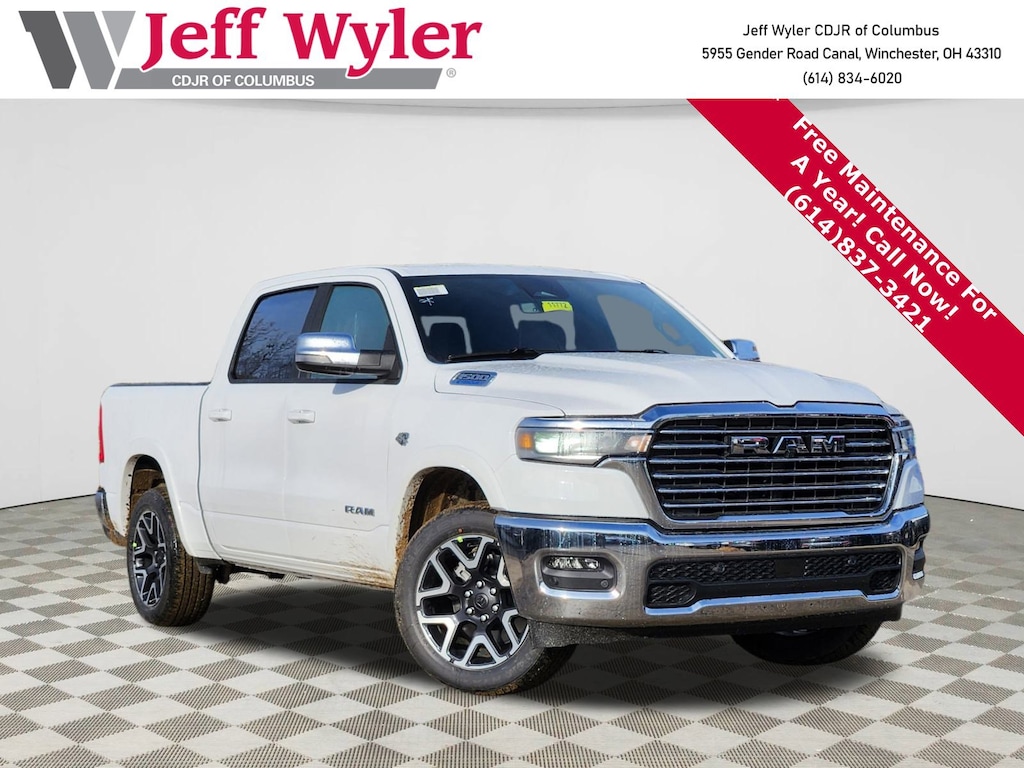 Jeff Wyler Columbus Auto Mall is honored to offer this outstanding 2026 Ram 1500 Laramie in Bright White Clearcoat. Well equipped with: Bed Utility Group (Exterior 115V AC Outlet, MOPAR 4 Adjustable Cargo Tie-Down Hooks, and MOPAR Spray in Bedliner), Laramie Level 1 Equipment Group (Rain Sensitive Windshield Wipers and Remote Tailgate Release), Quick Order Package 27H Laramie, 10 Speakers, 4-Wheel Disc Brakes, 4G LTE Wi-Fi Hot Spot, ABS brakes, Active Noise Control System, Air Conditioning, Alloy wheels, AM/FM radio: SiriusXM with 360L, Apple CarPlay/Android Auto, Audio memory, Auto High-beam Headlights, Auto Power-Folding Mirrors, Auto-dimming door mirrors, Auto-Dimming Exterior Driver Mirror, Auto-dimming Rear-View mirror, Automatic temperature control, Brake assist, Bumpers: chrome, Chrome Exterior Mirrors, Compass, Connected Travel and Traffic Services, Connectivity - US/Canada, Convex Wide-Angle Exterior Mirror Insert, Delay-off headlights, Driver door bin, Driver vanity mirror, Dual front impact airbags, Dual front side impact airbags, Electronic Stability Control, Exterior Mirrors Courtesy Lamps, Exterior Mirrors with Heating Element, Exterior Mirrors with Memory, Exterior Mirrors with Supplemental Signals, Front anti-roll bar, Front Bucket Seats, Front Center Armrest w/Storage, Front dual zone A/C, Front fog lights, Front reading lights, Front wheel independent suspension, Fully automatic headlights, Garage door transmitter, GPS Navigation, Heated door mirrors, Heated front seats, Heated rear seats, Heated steering wheel, Illuminated entry, Integrated Center Stack Radio, Integrated Voice Command with Bluetooth, Leather steering wheel, Leather Trimmed Bucket Seats, Low tire pressure warning, Memory seat, MOPAR Front and Rear Rubber Floor Mats, Navigation System, Occupant sensing airbag, Off-Road Information Pages, Outside temperature display, Overhead airbag, Overhead console, Panic alarm, ParkView Rear Back-Up Camera, Passenger door bin, Passenger vanity mirror, Power door mirrors, Power driver seat, Power passenger seat, Power steering, Power windows, Radio data system, Radio: Uconnect 5 Navigation with 12.0" Display, RAM Grille Badge - Chrome, Rear anti-roll bar, Rear reading lights, Rear seat center armrest, Rear step bumper, Remote keyless entry, Security system, SiriusXM Radio Service, SiriusXM with 360L, Speed control, Split folding rear seat, Steering wheel mounted audio controls, Tachometer, Telescoping steering wheel, Tilt steering wheel, Traction control, Trip computer, Turn signal indicator mirrors, USB Host Flip, Variably intermittent wipers, Ventilated front seats, Voltmeter, and Wheels: 20" x 9" Premium Paint/Polish.Wyler Family First Package Includes: NanoCure Appearance Protection: Exterior & Interior Chemical Sealant Applied to Protect Against Environmental Hazards (7 Year Warranty Coverage). Pulse- Rear End Collision Avoidance System Theft Deterrent Strategy gives you 5 Years of Coverage against vehicle theft, Offering up to a $5,000 benefit. Price does not include Tax, Title, License and Documentary Fee$2000 - 2026 Midwest BC Conquest Bonus Cash . Exp. 01/05/2026 $3500 - 2026 National Retail Consumer Cash . Exp. 01/05/2026 $500 - 2026 National 2026 Military Bonus Cash . Exp. 01/05/2026