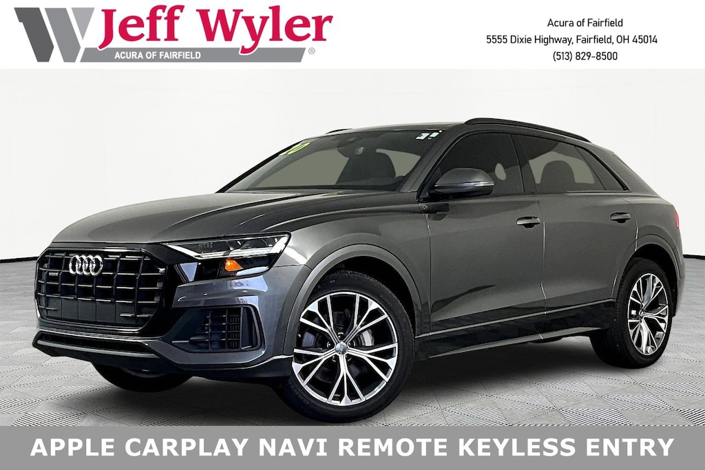 Jeff Wyler Acura of Fairfield is proud to offer this terrific 2020 Audi Q8 55 Premium in Gray Metallic. Black Optic Package (Wheels: 21" 5-W-Spoke-Design), Cold Weather Package (Heated Rear Seats and Heated Steering Wheel), Convenience Package (Audi Phone Box w/Wireless Charging, Audi Side Assist w/Rear Cross Traffic Assist, and Heated Auto-Dimming Power Folding Exterior Mirrors), 10 Speakers, 4-Wheel Disc Brakes, ABS brakes, Adaptive suspension, Air Conditioning, Alloy wheels, AM/FM radio: SiriusXM, Audi Guard Protection Kit, Audi smartphone interface (Apple CarPlay/Android Auto), Auto High-beam Headlights, Auto-dimming Rear-View mirror, Automatic temperature control, Axle Ratio: TBA, Black Cloth Headliner, Black Front & Rear Bumpers, Black Roof Rails & Mask, Brake assist, Bumpers: body-color, Compass, Delay-off headlights, Delete Front License Plate Holder, Driver door bin, Driver vanity mirror, Dual front impact airbags, Dual front side impact airbags, Electronic Stability Control, Emergency communication system: Audi connect CARE, PRIME & PLUS, Exterior Parking Camera Rear, Four wheel independent suspension, Front & Rear Doors Audi Beam-Rings, Front anti-roll bar, Front Bucket Seats, Front Center Armrest, Front dual zone A/C, Front fog lights, Front reading lights, Fully automatic headlights, Garage door transmitter: HomeLink, Genuine wood door panel insert, Heated door mirrors, Heated Front Bucket Seats, Heated front seats, Illuminated entry, Leather Seating Surfaces, Leather Shift Knob, Leather steering wheel, Low tire pressure warning, Memory seat, Navigation System, Occupant sensing airbag, Outside temperature display, Overhead airbag, Overhead console, Panic alarm, Passenger door bin, Passenger vanity mirror, Power door mirrors, Power driver seat, Power Liftgate, Power moonroof, Power passenger seat, Power steering, Power windows, Radio data system, Radio: Audi MMI Navigation Plus w/Touch Response, Rain sensing wipers, Rear air conditioning, Rear anti-roll bar, Rear fog lights, Rear reading lights, Rear seat center armrest, Rear window defroster, Rear window wiper, Remote keyless entry, Roof rack: rails only, Security system, Speed control, Speed-sensing steering, Split folding rear seat, Spoiler, Steering wheel memory, Steering wheel mounted audio controls, Tachometer, Telescoping steering wheel, Tilt steering wheel, Traction control, Trip computer, Turn signal indicator mirrors, Variably intermittent wipers, and Wheels: 20" 5-Arm Design ***ONLINE PRICE DOES NOT INCLUDE WYLER FAMILY FIRST PACKAGE*** CARFAX One-Owner. Clean CARFAX. Odometer is 3231 miles below market average!Proudly Serving: Cincinnati, Dayton, Columbus, Louisville, Lexington, Indianapolis, Hamilton, Florence, Alexandria, Beavercreek, Springdale, West Chester, Monroe, Fairfield, Kenwood, Newport and all of greater Cincinnati Ohio, Indiana, and Northern Kentucky.