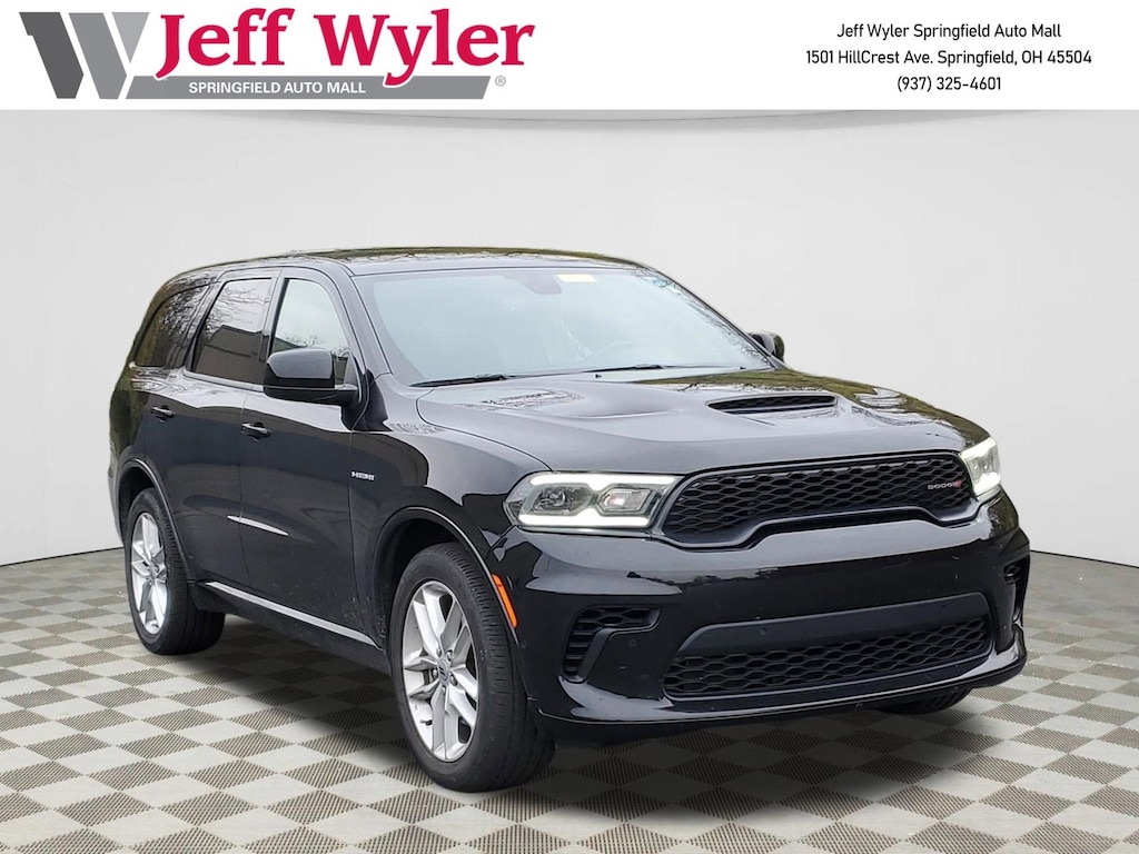 Jeff Wyler Springfield Auto Mall is honored to offer this wonderful 2024 Dodge Durango R/T in DB Black Crystal Clearcoat. Well equipped with: Quick Order Package 22S R/T, Trailer Tow Group IV (7 & 4 Pin Wiring Harness, Blind Spot w/Trailer Detection, Class IV Receiver Hitch, Rear Load Leveling Suspension, and Trailer Brake Control), 3.09 Rear Axle Ratio, 3rd row seats: split-bench, 4-Wheel Disc Brakes, 9 Speakers, ABS brakes, Air Conditioning, Alloy wheels, AM/FM radio: SiriusXM w/360L, Apple CarPlay/Android Auto, Auto High-beam Headlights, Auto-dimming Rear-View mirror, Auto-leveling suspension, Automatic temperature control, Brake assist, Bumpers: body-color, Cloth Bucket Seats w/Shift Insert, Compass, Delay-off headlights, Driver door bin, Driver vanity mirror, Dual front impact airbags, Dual front side impact airbags, Electronic Stability Control, Emergency communication system, Exterior Mirrors w/Heating Element, Four wheel independent suspension, Front anti-roll bar, Front Bucket Seats, Front Center Armrest w/Storage, Front dual zone A/C, Front License Plate Bracket, Front reading lights, Fully automatic headlights, Garage door transmitter, Gloss Black Exterior Mirrors, Heated door mirrors, Heated front seats, Heated steering wheel, Illuminated entry, Knee airbag, Leather steering wheel, Low tire pressure warning, Navigation system: TomTom, Occupant sensing airbag, Outside temperature display, Overhead airbag, Overhead console, Panic alarm, ParkView Rear Back-Up Camera, Passenger door bin, Passenger vanity mirror, Power door mirrors, Power driver seat, Power Liftgate, Power steering, Power windows, Radio data system, Radio: Uconnect 5 Nav w/10.1" Display, Rain sensing wipers, Rear air conditioning, Rear anti-roll bar, Rear reading lights, Rear seat center armrest, Rear window defroster, Rear window wiper, Red Accent Stitching, Remote keyless entry, Security system, Speed control, Speed-sensing steering, Speed-Sensitive Wipers, Split folding rear seat, Spoiler, Sport steering wheel, Steering wheel mounted audio controls, Tachometer, Telescoping steering wheel, Tilt steering wheel, Traction control, Trip computer, Variably intermittent wipers, Voltmeter, and Wheels: 20" x 8.0" Fine Silver. Ask about available certifications. Used vehicles 10 years of age or newer with less than 100,000 miles are eligible for the Wyler Assurance Program, but eligible vehicles must pass our reconditioning process and multi-point inspection. Provided the vehicle passes inspection, vehicles will be eligible for the 6 month/6,000 mile limited warranty. The 6 month/6,000 mile limited warranty is NOT available on AS-IS vehicles, wholesale vehicles, lease buyback/pass-thru vehicles or un-inspected vehicles. Note that this program can also apply to vehicles where the remaining factory coverage is less than 6 months or 6,000 miles. Please check the Federal Trade Commission (FTC) Buyers guide on the vehicle for full details as to whether or not warranty coverage may apply. Contact Dealer for additional details. The Wyler Assurance 6 month/6,000 Mile limited warranty ends 6 months from the date of the Retail Purchase Agreement (BUYERS ORDER) or when the vehicle's odometer registers 6,000 additional miles to the mileage listed on the BUYERS ORDER, whichever comes first. Your Deductible - The warranty holder on your contract pays the first $100 of each covered repair.