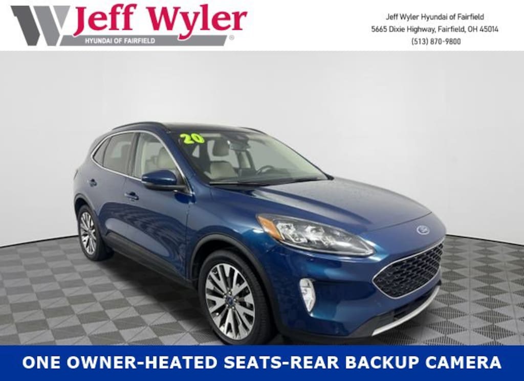 CARFAX One-Owner. Jeff Wyler Hyundai of Fairfield is delighted to offer this beautiful-looking 2020 Ford Escape Titanium Hybrid in Green. Well equipped with: Equipment Group 400A (Pedestrian Alert Sounder and Wireless Charging Pad), Titanium Premium Package 2.0 (110V/150W AC Power Outlet, Black Roof-Rack Side Rails, Head-Up Display, and Panoramic Vista Roof), 2.5L iVCT, eCVT, AWD, Android Auto, Apple CarPlay, CALL NOW FOR YOUR VIP APPOINTMENT 513-870-9800, FULLY SERVICED w/RECORDS, GUARANTEED FINANCING!! NO MATTER YOUR SITUATION WE CAN GET AN APPROVAL!!, THE #1 Volume dealer in the region! Come see why for yourself Today!!, WE PAY MORE FOR YOUR TRADE!!, 10 Speakers, 2.91 Axle Ratio, 4-Wheel Disc Brakes, ABS brakes, Air Conditioning, Alloy wheels, AM/FM radio: SiriusXM, Auto High-beam Headlights, Auto-dimming Rear-View mirror, Automatic temperature control, Brake assist, Bumpers: body-color, Compass, Delay-off headlights, Driver door bin, Driver vanity mirror, Dual front impact airbags, Dual front side impact airbags, Electronic Stability Control, Emergency communication system: SYNC 3 911 Assist, Exterior Parking Camera Rear, FordPass Connect, Four wheel independent suspension, Front anti-roll bar, Front Bucket Seats, Front Center Armrest, Front dual zone A/C, Front fog lights, Front reading lights, Fully automatic headlights, Garage door transmitter, Heated door mirrors, Heated front seats, Heated Leather-Trimmed Front Sport Contour Seats, Heated steering wheel, Illuminated entry, Knee airbag, Leather steering wheel, Low tire pressure warning, Memory seat, Navigation System, Occupant sensing airbag, Outside temperature display, Overhead airbag, Overhead console, Panic alarm, Passenger door bin, Passenger vanity mirror, Power door mirrors, Power driver seat, Power Liftgate, Power passenger seat, Power steering, Power windows, Radio data system, Radio: B&O Sound System by Bang & Olufsen, Rain sensing wipers, Rear anti-roll bar, Rear reading lights, Rear seat center armrest, Rear window defroster, Rear window wiper, Remote keyless entry, Security system, Speed control, Speed-sensing steering, Speed-Sensitive Wipers, Split folding rear seat, Spoiler, Steering wheel mounted audio controls, SYNC 3 Communications & Entertainment System, Telescoping steering wheel, Tilt steering wheel, Traction control, Trip computer, Turn signal indicator mirrors, Variably intermittent wipers, Voice-Activated Touchscreen Navigation System, and Wheels: 19" Machined-Face Aluminum. TO CHECK ON THE AVAILABILITY OF THIS VEHICLE REACH OUT TO ONE OF OUR TEAM MEMBERS!! ALSO SHOP ONLINE AT https://www.jeffwylerhyundaioffairfield.com/ Proudly Serving: Cincinnati, Dayton, Columbus, Louisville, Lexington, Indianapolis, Hamilton, Florence, Alexandria, Beavercreek, Springdale, West Chester, Monroe, Fairfield, Kenwood, Newport and all of greater Cincinnati Ohio, Indiana, and Northern Kentucky.