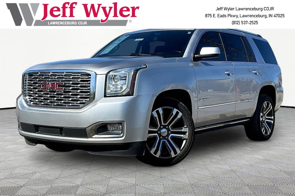 Jeff Wyler Chrysler Dodge Jeep of Lawrenceburg is pleased to offer this outstanding 2020 GMC Yukon Denali in Quicksilver Metallic. Denali Premium Package (Power Tilt-Sliding Sunroof w/Express-Open/Close, Pwr Retractable Assist Steps w/Perimeter Lighting, Wheel Locks, and Wheels: 22" x 8.5" Bright Aluminum), Enhanced Driver Alert Package (Automatic Emergency Braking, Forward Collision Alert, IntelliBeam Automatic High Beam On/Off, and Lane Keep Assist w/Lane Departure Warning), License Plate Front Mounting Package, Magnetic Ride Control Suspension Package, Memory Package, Preferred Equipment Group 5SA (4-Wheel Antilock Disc Brakes, 5 Auxiliary 12-volt Power Outlets, Black Assist Steps w/Chrome Strip, Bose Active Noise Cancellation, Hands Free Power Programmable Rear Liftgate, Heated Leather-Wrapped Steering Wheel, Inside Rear-View Auto-Dimming Mirror, Integrated Trailer Brake Controller, Lane Change Alert w/Side Blind Zone Alert, Passive Entry System, Power Release 2nd Row Bucket Seats, Power Tilt & Telescopic Steering Column, Power-Adjustable Pedals For Accelerator & Brake, Push Button Keyless Start, Rear Cross Traffic Alert, Remote Keyless Entry, Universal Home Remote, and Wireless Charging), 10 Speakers, 1st & 2nd Rows All-Weather Floor Liner (LPO), 3.23 Rear Axle Ratio, 3rd row seats: split-bench, 4-Wheel Disc Brakes, ABS brakes, Adaptive suspension, Adjustable pedals, Air Conditioning, Alloy wheels, AM/FM radio: SiriusXM, Apple CarPlay/Android Auto, Auto High-beam Headlights, Auto-dimming door mirrors, Auto-dimming Rear-View mirror, Auto-leveling suspension, Automatic temperature control, Bodyside moldings, Bose Centerpoint Surround Sound Audio System, Brake assist, Bumpers: body-color, CD Player, CD player, Compass, Delay-off headlights, Driver door bin, Driver vanity mirror, Dual front impact airbags, Dual front side impact airbags, Electronic Stability Control, Emergency communication system: OnStar and GMC connected services capable, Exterior Parking Camera Rear, Front anti-roll bar, Front Bucket Seats, Front Center Armrest, Front dual zone A/C, Front fog lights, Front reading lights, Front wheel independent suspension, Full-Feature Reclining Bucket Seats, Fully automatic headlights, Garage door transmitter, Genuine wood console insert, Genuine wood dashboard insert, Genuine wood door panel insert, Heads-Up Display, Heated & Ventilated Driver & Front Passenger Seats, Heated door mirrors, Heated front seats, Heated rear seats, Heated steering wheel, High-Intensity Discharge Headlights, Illuminated entry, Leather Shift Knob, Leather steering wheel, Low tire pressure warning, Memory seat, Navigation System, Occupant sensing airbag, Outside temperature display, Overhead airbag, Overhead console, Panic alarm, Passenger door bin, Passenger vanity mirror, Pedal memory, Perforated Leather-Appointed Seat Trim, Power door mirrors, Power driver seat, Power Liftgate, Power passenger seat, Power steering, Power windows, Premium audio system: IntelliLink, Radio: AM/FM/SiriusXM w/Navigation, Rain sensing wipers, Rear air conditioning, Rear anti-roll bar, Rear reading lights, Rear window defroster, Rear window wiper, Remote keyless entry, Roof rack: rails only, Security system, SiriusXM NavTraffic, SiriusXM Radio, Speed control, Speed-sensing steering, Split folding rear seat, Spoiler, Steering wheel memory, Steering wheel mounted audio controls, Tachometer, Telescoping steering wheel, Tilt steering wheel, Traction control, Trip computer, Turn signal indicator mirrors, Variably intermittent wipers, Ventilated front seats, Voltmeter, and Wheels: 20" x 9" Bright Machined Aluminum Our PRE-OWNED vehicles are put through a rigorous 167- POINT QUALITY ASSURANCE INSPECTION along with an average amount of over $1,400.00 SPENT to recondition each vehicle so we can be sure to deliver you the highest quality vehicle like you deserve! ***ONLINE PRICE DOES NOT INCLUDE WYLER FAMILY FIRST PACKAGE*** Stop by 4136 Shelbyville Road to see for yourself,