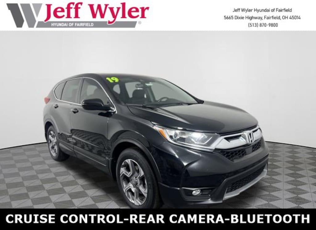 Jeff Wyler Hyundai of Fairfield is pumped up to offer this attractive 2019 Honda CR-V EX-L in Black. Well equipped with: Android Auto, Apple CarPlay, CALL NOW FOR YOUR VIP APPOINTMENT 513-870-9800, FULLY SERVICED w/RECORDS, GUARANTEED FINANCING!! NO MATTER YOUR SITUATION WE CAN GET AN APPROVAL!!, THE #1 Volume dealer in the region! Come see why for yourself Today!!, WE PAY MORE FOR YOUR TRADE!!, 18" Alloy Wheels, 4-Wheel Disc Brakes, 5.64 Axle Ratio, 8 Speakers, ABS brakes, Air Conditioning, Alloy wheels, AM/FM radio: SiriusXM, Apple CarPlay/Android Auto, Auto High-beam Headlights, Auto-dimming Rear-View mirror, Automatic temperature control, Blind Spot Information (BSI) System warning, Brake assist, Bumpers: body-color, Compass, Delay-off headlights, Driver door bin, Driver vanity mirror, Dual front impact airbags, Dual front side impact airbags, Electronic Stability Control, Exterior Parking Camera Rear, Forward collision: Collision Mitigation Braking System (CMBS) + FCW mitigation, Four wheel independent suspension, Front anti-roll bar, Front Bucket Seats, Front Center Armrest, Front dual zone A/C, Front fog lights, Front reading lights, Fully automatic headlights, Garage door transmitter: HomeLink, Heated door mirrors, Heated Front Bucket Seats, Heated front seats, Illuminated entry, Lane departure: Lane Keeping Assist System (LKAS) active, Leather Seat Trim, Leather Shift Knob, Low tire pressure warning, Memory seat, Occupant sensing airbag, Outside temperature display, Overhead airbag, Overhead console, Panic alarm, Passenger door bin, Passenger vanity mirror, Power door mirrors, Power driver seat, Power Liftgate, Power moonroof, Power passenger seat, Power steering, Power windows, Radio data system, Radio: AM/FM/SiriusXM Audio System, Rear anti-roll bar, Rear seat center armrest, Rear window defroster, Rear window wiper, Remote keyless entry, Security system, Speed control, Speed-sensing steering, Speed-Sensitive Wipers, Split folding rear seat, Spoiler, Steering wheel mounted audio controls, Tachometer, Telescoping steering wheel, Tilt steering wheel, Traction control, Trip computer, Turn signal indicator mirrors, and Variably intermittent wipers. TO CHECK ON THE AVAILABILITY OF THIS VEHICLE REACH OUT TO ONE OF OUR TEAM MEMBERS!! ALSO SHOP ONLINE AT https://www.jeffwylerhyundaioffairfield.com/ Proudly Serving: Cincinnati, Dayton, Columbus, Louisville, Lexington, Indianapolis, Hamilton, Florence, Alexandria, Beavercreek, Springdale, West Chester, Monroe, Fairfield, Kenwood, Newport and all of greater Cincinnati Ohio, Indiana, and Northern Kentucky.