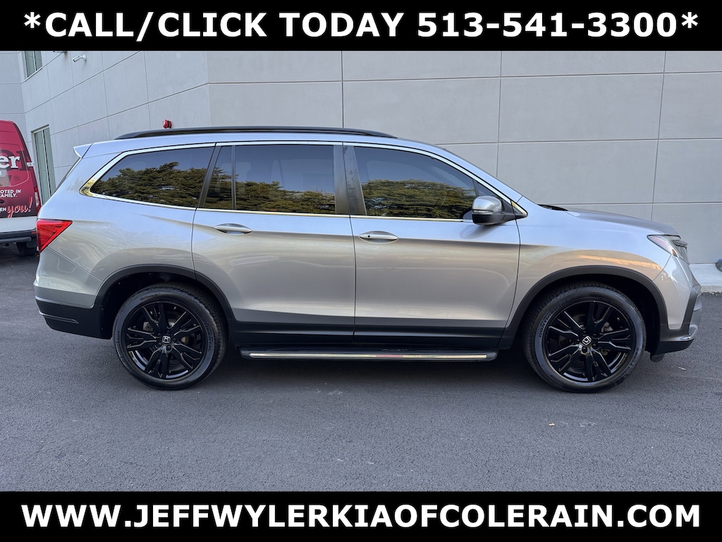 Jeff Wyler Kia of Colerain is delighted to offer this fantastic-looking 2021 Honda Pilot Special Edition in Lunar Silver Metallic. 3rd row seats: split-bench, 4-Wheel Disc Brakes, 4.33 Axle Ratio, 7 Speakers, A/V remote: CabinControl, ABS brakes, Air Conditioning, Alloy wheels, AM/FM radio: SiriusXM, Apple CarPlay/Android Auto, Auto High-beam Headlights, Auto-dimming Rear-View mirror, Automatic temperature control, Blind Spot Information (BSI) System warning, Brake assist, Bumpers: body-color, Delay-off headlights, Driver door bin, Driver vanity mirror, Dual front impact airbags, Dual front side impact airbags, Electronic Stability Control, Emergency communication system: HondaLink Assist, Exterior Parking Camera Rear, Forward collision: Collision Mitigation Braking System (CMBS) + FCW mitigation, Four wheel independent suspension, Front anti-roll bar, Front Bucket Seats, Front Center Armrest, Front dual zone A/C, Front fog lights, Front reading lights, Fully automatic headlights, Garage door transmitter: HomeLink, Heated door mirrors, Heated Front Bucket Seats, Heated front seats, Illuminated entry, Lane departure: Lane Keeping Assist System (LKAS) active, Leather Seat Trim, Low tire pressure warning, Memory seat, Occupant sensing airbag, Outside temperature display, Overhead airbag, Overhead console, Panic alarm, Passenger door bin, Passenger vanity mirror, Power door mirrors, Power driver seat, Power Liftgate, Power moonroof, Power passenger seat, Power steering, Power windows, Radio data system, Radio: 215-Watt Audio System, Rear air conditioning, Rear anti-roll bar, Rear reading lights, Rear seat center armrest, Rear window defroster, Rear window wiper, Reclining 3rd row seat, Remote keyless entry, Roof rack: rails only, Security system, Speed control, Speed-sensing steering, Speed-Sensitive Wipers, Split folding rear seat, Spoiler, Steering wheel mounted audio controls, Tachometer, Telescoping steering wheel, Tilt steering wheel, Traction control, Trip computer, Turn signal indicator mirrors, Variably intermittent wipers, and Wheels: 20" Exclusive Black-Painted Alloy Our PRE-OWNED vehicles are put through a rigorous 167- POINT QUALITY ASSURANCE INSPECTION along with an average amount of over $1,400.00 SPENT to recondition each vehicle so we can be sure to deliver you the highest quality vehicle like you deserve! ***ONLINE PRICE DOES NOT INCLUDE WYLER FAMILY FIRST PACKAGE***