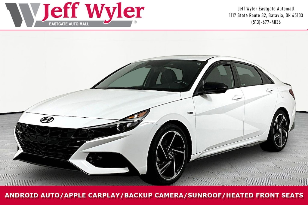 Jeff Wyler Eastgate Auto Mall is proud to offer this charming 2023 Hyundai Elantra N Line in Lunar White. Well equipped with: Option Group 01, 18" x 7.5J Alloy Wheels, 4-Wheel Disc Brakes, 6 Speakers, ABS brakes, Air Conditioning, Alloy wheels, AM/FM radio: SiriusXM, Apple CarPlay & Android Auto, Auto High-beam Headlights, Automatic temperature control, Brake assist, Bumpers: body-color, Cargo Net, Carpeted Floor Mats, Combination Cloth & Leather Seating Surfaces, Delay-off headlights, Driver door bin, Driver vanity mirror, Dual front impact airbags, Dual front side impact airbags, Electronic Stability Control, Emergency communication system: Blue Link Connected Car Service (3-year complimentary subscription), Exterior Parking Camera Rear, First Aid Kit, Four wheel independent suspension, Front anti-roll bar, Front Bucket Seats, Front Center Armrest, Front dual zone A/C, Front reading lights, Fully automatic headlights, Heated door mirrors, Heated front seats, Heated Front Sport Bucket Seats, Illuminated entry, Leather Shift Knob, Leather steering wheel, Low tire pressure warning, Navigation System, Occupant sensing airbag, Outside temperature display, Overhead airbag, Overhead console, Panic alarm, Passenger door bin, Passenger vanity mirror, Power door mirrors, Power driver seat, Power moonroof, Power steering, Power windows, Radio: AM/FM/HD/SiriusXM Display Audio, Rear anti-roll bar, Rear seat center armrest, Rear window defroster, Remote keyless entry, Security system, Speed control, Speed-sensing steering, Split folding rear seat, Spoiler, Sport steering wheel, Steering wheel mounted audio controls, Tachometer, Telescoping steering wheel, Tilt steering wheel, Traction control, Trip computer, Variably intermittent wipers, and Wheel Locks. CARFAX One-Owner. Clean CARFAX. Ask about available certifications. Used vehicles 10 years of age or newer with less than 100,000 miles are eligible for the Wyler Assurance Program, but eligible vehicles must pass our reconditioning process and multi-point inspection. Provided the vehicle passes inspection, vehicles will be eligible for the 6 month/6,000 mile limited warranty. The 6 month/6,000 mile limited warranty is NOT available on AS-IS vehicles, wholesale vehicles, lease buyback/pass-thru vehicles or un-inspected vehicles. Note that this program can also apply to vehicles where the remaining factory coverage is less than 6 months or 6,000 miles. Please check the Federal Trade Commission (FTC) Buyers guide on the vehicle for full details as to whether or not warranty coverage may apply. Contact Dealer for additional details. The Wyler Assurance 6 month/6,000 Mile limited warranty ends 6 months from the date of the Retail Purchase Agreement (BUYERS ORDER) or when the vehicle's odometer registers 6,000 additional miles to the mileage listed on the BUYERS ORDER, whichever comes first. Your Deductible - The warranty holder on your contract pays the first $100 of each covered repair.