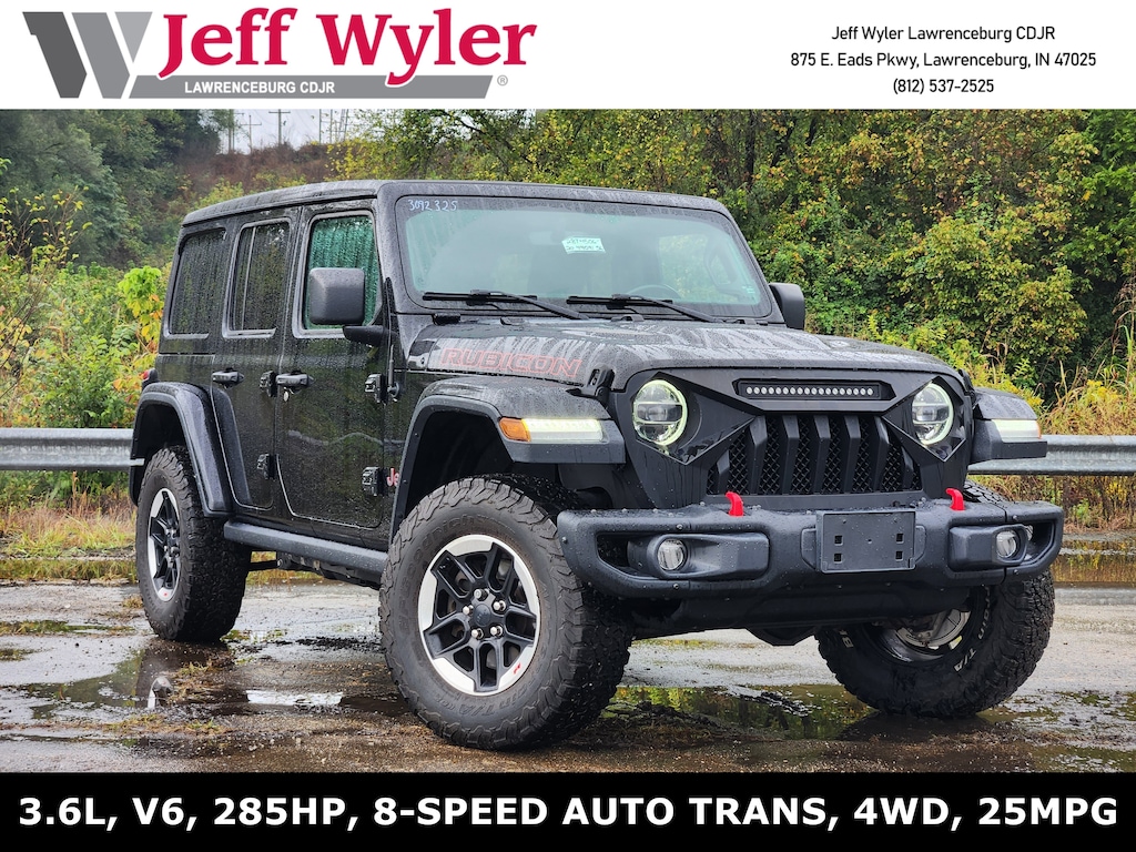 Jeff Wyler Chrysler Dodge Jeep of Lawrenceburg is very proud to offer this stunning-looking and fun 2020 Jeep Wrangler Unlimited Rubicon in Black Clearcoat. 8.4" Radio & Premium Audio Group (1-Year SiriusXM Guardian Trial, 4G LTE Wi-Fi Hot Spot, 5-Year SiriusXM Traffic Service, 5-Year SiriusXM Travel Link Service, 8.4" Touchscreen Display, Alpine Premium Audio System, Auto-Dimming Rear-View Mirror, Emergency/Assistance Call, For Details, Visit DriveUconnect.com, GPS Navigation, HD Radio, Radio: Uconnect 4C Nav w/8.4" Display, SiriusXM Traffic Plus, and SiriusXM Travel Link), Cold Weather Group (Heated Front Seats and Heated Steering Wheel), LED Lighting Group (Daytime Running Lamps LED Accents, Front LED Fog Lamps, LED Reflector Headlamps, and LED Taillamps), Quick Order Package 24R, Safety Group (Blind Spot & Cross Path Detection and ParkSense Rear Park Assist System), Steel Bumper Group (Steel Front Bumper and Steel Rear Bumper), Trailer Tow & HD Electrical Group (240 Amp Alternator, 7 & 4 Pin Wiring Harness, 700 Amp Maintenance Free Battery, Auxiliary Switches, and Class II Receiver Hitch), 4-Wheel Disc Brakes, 4.10 Rear Axle Ratio, 8 Speakers, ABS brakes, Air Conditioning, Alloy wheels, AM/FM radio: SiriusXM, Apple CarPlay/Android Auto, Automatic temperature control, Aux Battery, BF Goodrich Brand Tires, Body Color Fender Flares, Brake assist, Compass, Delay-off headlights, Driver door bin, Driver vanity mirror, Dual front impact airbags, Dual front side impact airbags, Electronic Stability Control, Front anti-roll bar, Front Bucket Seats, Front Center Armrest w/Storage, Front dual zone A/C, Front fog lights, Front reading lights, Fully automatic headlights, Garage door transmitter, Heated door mirrors, Illuminated entry, Integrated roll-over protection, Leather steering wheel, Low tire pressure warning, MOPAR All-Weather Floor Mats (DISC), MOPAR Cargo Tub Liner (DISC), MOPAR Plastic Door Sill Guards, Non-Lock Fuel Cap w/o Discriminator, Occupant sensing airbag, Outside temperature display, Panic alarm, ParkView Rear Back-Up Camera, Passenger door bin, Passenger vanity mirror, Performance Suspension, Power door mirrors, Power steering, Power Top Quarter Window Storage Bag, Power windows, Premium Cloth Low-Back Bucket Seats, Radio data system, Radio: Uconnect 4 w/7" Display, Rear anti-roll bar, Rear reading lights, Rear Window Defroster, Rear Window Wiper/Washer, Remote keyless entry, Remote Proximity Keyless Entry, Remote Start System, Removable Rear Quarter Windows, Security system, Sky 1-Touch Power Top, Speed control, Split folding rear seat, Steering wheel mounted audio controls, Stop-Start Dual Battery System, Tachometer, Telescoping steering wheel, Tilt steering wheel, Traction control, Trip computer, Variably intermittent wipers, Voltmeter, Wheels: 17" x 7.5" Black w/Machined Lip, and Wheels: 17" x 7.5" Machined w/Black Pockets Our PRE-OWNED vehicles are put through a rigorous 167- POINT QUALITY ASSURANCE INSPECTION along with an average amount of over $1,400.00 SPENT to recondition each vehicle so we can be sure to deliver you the highest quality vehicle like you deserve! ***ONLINE PRICE DOES NOT INCLUDE WYLER FAMILY FIRST PACKAGE*** Stop by 4136 Shelbyville Road to see for yourself, or give us a call @ 502-897-3151 to schedule your test drive! Ask about available certifications.