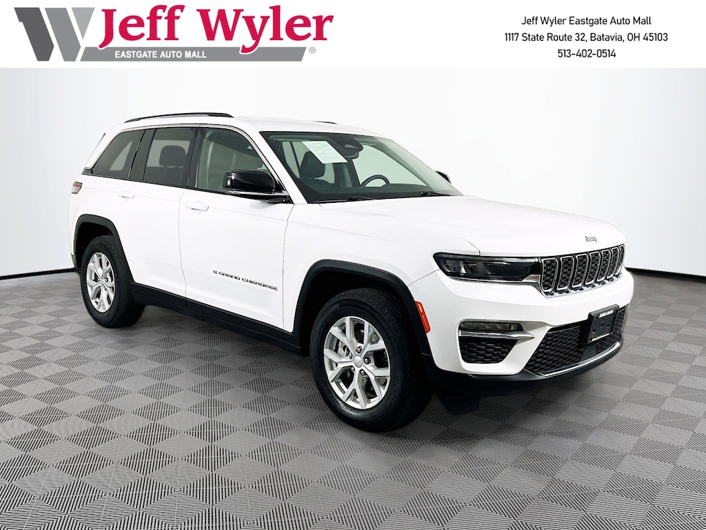 Jeff Wyler Eastgate Auto Mall is proud to offer this handsome 2023 Jeep Grand Cherokee Limited in Bright White Clearcoat. Well equipped with: Quick Order Package 23E, Trailer Tow Prep Group (B) (DISC) (220 Amp Alternator, Automatic Headlamp Levelling System, Heavy-Duty Engine Cooling, Rear Load Levelling Suspension, and Trailer Hitch Zoom), 3.45 Rear Axle Ratio, 4-Wheel Disc Brakes, 6 Speakers, ABS brakes, Active Noise Control System, Air Conditioning, Alloy wheels, AM/FM radio: SiriusXM with 360L, Anti-whiplash front head restraints, Audio memory, Auto High-beam Headlights, Automatic temperature control, Brake assist, Bumpers: body-color, Capri Leatherette Seats, Compass, Delay-off headlights, Driver door bin, Driver vanity mirror, Dual front impact airbags, Dual front side impact airbags, Electronic Stability Control, Emergency communication system, Four wheel independent suspension, Front anti-roll bar, Front Bucket Seats, Front Center Armrest w/Storage, Front dual zone A/C, Front fog lights, Front License Plate Bracket, Front Passenger Interactive Display, Front reading lights, Fully automatic headlights, Garage door transmitter, Heated door mirrors, Heated front seats, Heated rear seats, Heated steering wheel, Illuminated entry, Knee airbag, Low tire pressure warning, Memory seat, Molded In Color Black/Gloss Black Roof Rails, Navigation System, Normal Duty Suspension, Occupant sensing airbag, Outside temperature display, Overhead airbag, Overhead console, Panic alarm, ParkView Rear Back-Up Camera, Passenger door bin, Passenger vanity mirror, Power door mirrors, Power driver seat, Power Liftgate, Power passenger seat, Power steering, Power windows, Radio data system, Radio: Uconnect 5 Nav w/10.1" Display, Rear anti-roll bar, Rear reading lights, Rear window defroster, Rear window wiper, Remote keyless entry, Security system, Speed control, Speed-Sensitive Wipers, Split folding rear seat, Spoiler, Steering wheel mounted audio controls, Tachometer, Telescoping steering wheel, Tilt steering wheel, Traction control, Trip computer, Turn signal indicator mirrors, Variably intermittent wipers, Voltmeter, and Wheels: 18" x 8" Fully Painted Aluminum. CARFAX One-Owner. Clean CARFAX. Ask about available certifications. Used vehicles 10 years of age or newer with less than 100,000 miles are eligible for the Wyler Assurance Program, but eligible vehicles must pass our reconditioning process and multi-point inspection. Provided the vehicle passes inspection, vehicles will be eligible for the 6 month/6,000 mile limited warranty. The 6 month/6,000 mile limited warranty is NOT available on AS-IS vehicles, wholesale vehicles, lease buyback/pass-thru vehicles or un-inspected vehicles. Note that this program can also apply to vehicles where the remaining factory coverage is less than 6 months or 6,000 miles. Please check the Federal Trade Commission (FTC) Buyers guide on the vehicle for full details as to whether or not warranty coverage may apply. Contact Dealer for additional details. The Wyler Assurance 6 month/6,000 Mile limited warranty ends 6 months from the date of the Retail Purchase Agreement (BUYERS ORDER) or when the vehicle's odometer registers 6,000 additional miles to the mileage listed on the BUYERS ORDER, whichever comes first. Your Deductible - The warranty holder on your contract pays the first $100 of each covered repair.