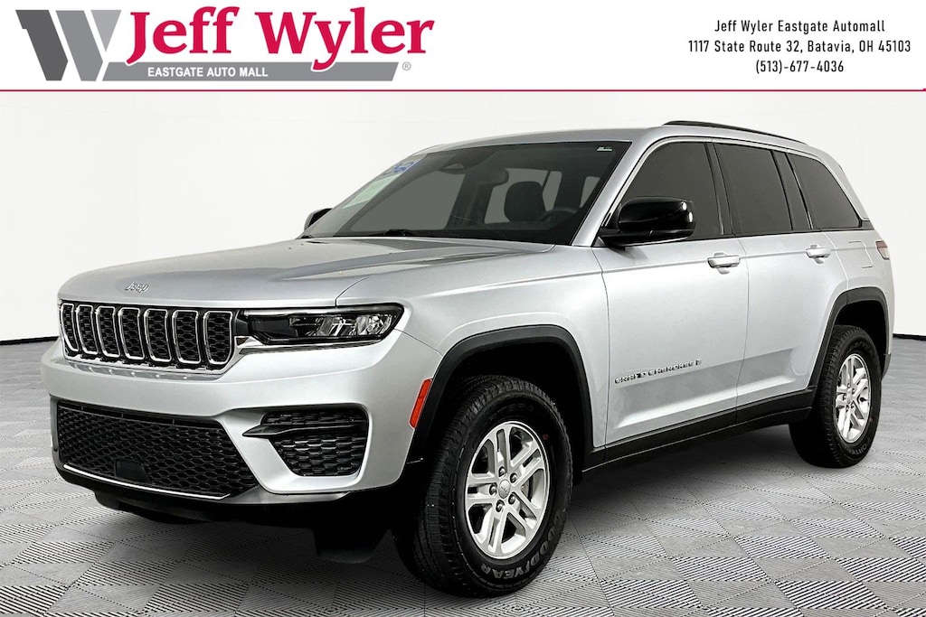 Jeff Wyler Eastgate Auto Mall is pumped up to offer this attractive 2024 Jeep Grand Cherokee Laredo in Silver Zynith. Well equipped with: Luxury Tech Group I (115V Auxiliary Power Outlet, Heated Front Seats, Heated Steering Wheel, Power Liftgate, Rain Sensitive Windshield Wipers, Remote Start System, Secondary Active Grille Shutters, Selectable Tire Fill Alert, and Wireless Charging Pad), Quick Order Package 23A Laredo, 3.45 Rear Axle Ratio, 4-Wheel Disc Brakes, 6 Speakers, ABS brakes, Air Conditioning, Alloy wheels, Anti-whiplash front head restraints, Automatic temperature control, Brake assist, Bumpers: body-color, Cloth Seats, Compass, Delay-off headlights, Driver door bin, Driver vanity mirror, Dual front impact airbags, Dual front side impact airbags, Electronic Stability Control, Emergency communication system, Four wheel independent suspension, Front anti-roll bar, Front Bucket Seats, Front Center Armrest w/Storage, Front dual zone A/C, Front License Plate Bracket, Front reading lights, Fully automatic headlights, Heated door mirrors, Illuminated entry, Knee airbag, Low tire pressure warning, Normal Duty Suspension, Occupant sensing airbag, Outside temperature display, Overhead airbag, Overhead console, Panic alarm, ParkView Rear Back-Up Camera, Passenger door bin, Passenger vanity mirror, Power door mirrors, Power driver seat, Power steering, Power windows, Radio data system, Radio: Uconnect 5 w/8.4" Display, Rear anti-roll bar, Rear reading lights, Rear window defroster, Rear window wiper, Remote keyless entry, Security system, Speed control, Speed-Sensitive Wipers, Split folding rear seat, Spoiler, Steering wheel mounted audio controls, Tachometer, Telescoping steering wheel, Tilt steering wheel, Traction control, Trip computer, Variably intermittent wipers, Voltmeter, and Wheels: 17" x 6.5" Fully Painted Aluminum. CARFAX One-Owner. Clean CARFAX. Ask about available certifications. Used vehicles 10 years of age or newer with less than 100,000 miles are eligible for the Wyler Assurance Program, but eligible vehicles must pass our reconditioning process and multi-point inspection. Provided the vehicle passes inspection, vehicles will be eligible for the 6 month/6,000 mile limited warranty. The 6 month/6,000 mile limited warranty is NOT available on AS-IS vehicles, wholesale vehicles, lease buyback/pass-thru vehicles or un-inspected vehicles. Note that this program can also apply to vehicles where the remaining factory coverage is less than 6 months or 6,000 miles. Please check the Federal Trade Commission (FTC) Buyers guide on the vehicle for full details as to whether or not warranty coverage may apply. Contact Dealer for additional details. The Wyler Assurance 6 month/6,000 Mile limited warranty ends 6 months from the date of the Retail Purchase Agreement (BUYERS ORDER) or when the vehicle's odometer registers 6,000 additional miles to the mileage listed on the BUYERS ORDER, whichever comes first. Your Deductible - The warranty holder on your contract pays the first $100 of each covered repair.