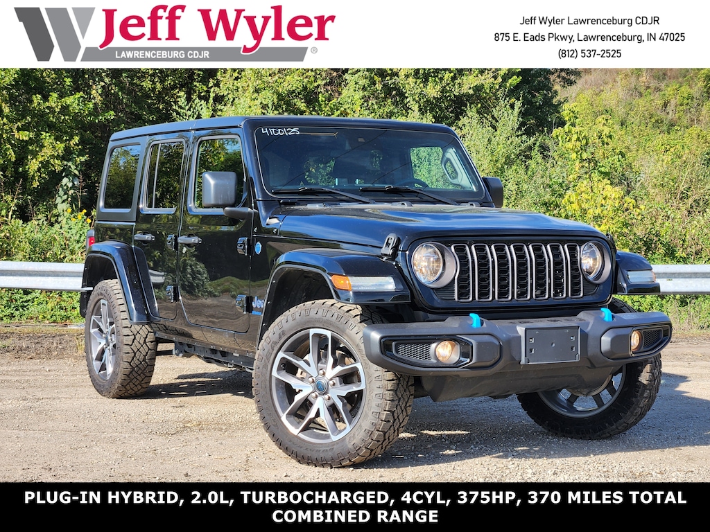 Jeff Wyler Chrysler Dodge Jeep of Lawrenceburg is pleased to offer this great-looking and fun 2024 Jeep Wrangler Sport S 4xe in Black Clearcoat. Quick Order Package 29U Sport S, 2.0L I4 DOHC, 3.73 Rear Axle Ratio, 4-Wheel Disc Brakes, 8 Speakers, ABS brakes, Air Conditioning, Alloy wheels, Apple CarPlay/Android Auto, Automatic temperature control, Black 3-Piece Hard Top, Brake assist, Cloth Low-Back Bucket Seats, Compass, Delay-off headlights, Driver door bin, Driver vanity mirror, Dual front impact airbags, Dual front side impact airbags, Electronic Stability Control, Freedom Panel Storage Bag, Front anti-roll bar, Front Bucket Seats, Front Center Armrest w/Storage, Front dual zone A/C, Front fog lights, Front License Plate Bracket, Front reading lights, Fully automatic headlights, Heated door mirrors, Illuminated entry, Integrated roll-over protection, Low tire pressure warning, No Soft Top, Occupant sensing airbag, Outside temperature display, Overhead airbag, Panic alarm, ParkView Rear Back-Up Camera, Passenger door bin, Passenger vanity mirror, Power door mirrors, Power steering, Power windows, Radio data system, Radio: Uconnect 5 w/12.3" Display, Rear anti-roll bar, Rear reading lights, Rear Window Defroster, Rear Window Wiper/Washer, Remote keyless entry, Security system, Speed control, Split folding rear seat, Sport Suspension, Steering wheel mounted audio controls, Tachometer, Telescoping steering wheel, Tilt steering wheel, Traction control, Trip computer, Variably intermittent wipers, Voltmeter, and Wheels: 20" x 8" Machined/Painted Gray Our PRE-OWNED vehicles are put through a rigorous 167- POINT QUALITY ASSURANCE INSPECTION along with an average amount of over $1,400.00 SPENT to recondition each vehicle so we can be sure to deliver you the highest quality vehicle like you deserve! ***ONLINE PRICE DOES NOT INCLUDE WYLER FAMILY FIRST PACKAGE*** Stop by 4136 Shelbyville Road to see for yourself, or give us a call @ 502-897-3151 to schedule your test drive! Ask about available certifications.