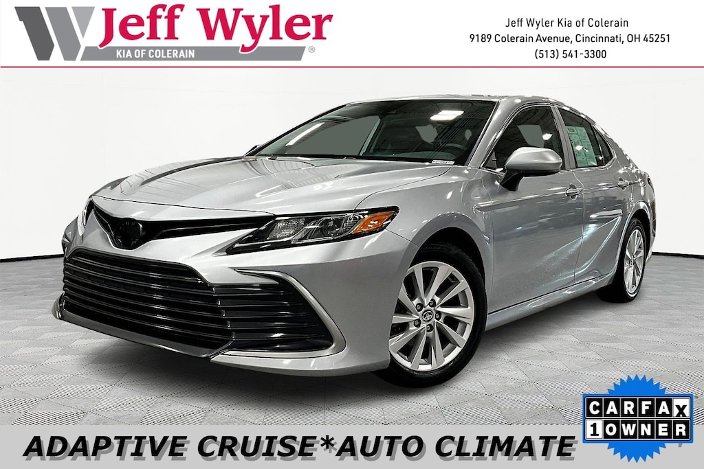 Jeff Wyler Kia of Colerain is excited to offer this wonderful 2022 Toyota Camry LE in Celestial Silver Metallic. 4-Wheel Disc Brakes, 6 Speakers, 7.5J x 17" Alloy Wheels, ABS brakes, Air Conditioning, Alloy wheels, AM/FM radio: SiriusXM, Apple CarPlay/Android Auto, Auto High-beam Headlights, Automatic temperature control, Brake assist, Bumpers: body-color, Delay-off headlights, Driver door bin, Driver vanity mirror, Dual front impact airbags, Dual front side impact airbags, Electronic Stability Control, Emergency communication system: Safety Connect with 1-year trial, Exterior Parking Camera Rear, Fabric Seat Trim, Four wheel independent suspension, Front anti-roll bar, Front Bucket Seats, Front Center Armrest, Front dual zone A/C, Front reading lights, Fully automatic headlights, Illuminated entry, Knee airbag, Low tire pressure warning, Occupant sensing airbag, Outside temperature display, Overhead airbag, Overhead console, Panic alarm, Passenger door bin, Passenger vanity mirror, Power door mirrors, Power driver seat, Power steering, Power windows, Radio data system, Radio: AM/FM Audio System, Rear anti-roll bar, Rear seat center armrest, Rear side impact airbag, Rear window defroster, Remote keyless entry, Security system, Speed control, Speed-sensing steering, Split folding rear seat, Steering wheel mounted audio controls, Tachometer, Telescoping steering wheel, Tilt steering wheel, Traction control, Trip computer, and Variably intermittent wipers Our PRE-OWNED vehicles are put through a rigorous 167- POINT QUALITY ASSURANCE INSPECTION along with an average amount of over $1,400.00 SPENT to recondition each vehicle so we can be sure to deliver you the highest quality vehicle like you deserve! ***ONLINE PRICE DOES NOT INCLUDE WYLER FAMILY FIRST PACKAGE***